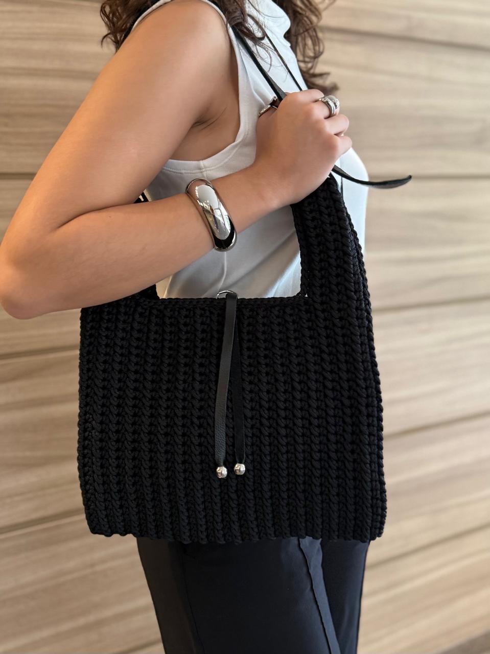 Feita artesanalmente em crochê com fio de poliéster. Forro de algodão. Alça de couro removível. Fecho com botão imantado.